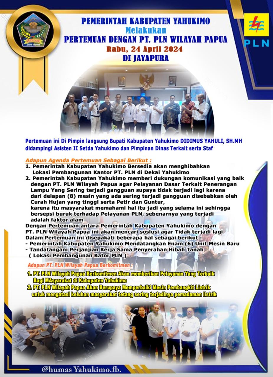 Dengan pertemuan antara Pemerintah kabupaten Yahukimo dengan PT.PLN wilayah Papua ini akan mencari solusi agar tidak terjadi lagi dalam pertemuan ini disepakati beberapa hal sebagai berikut: